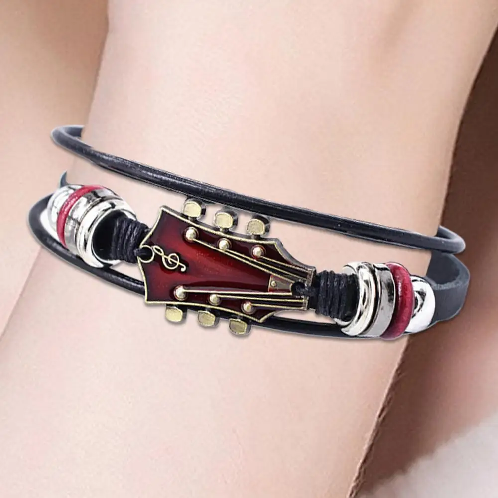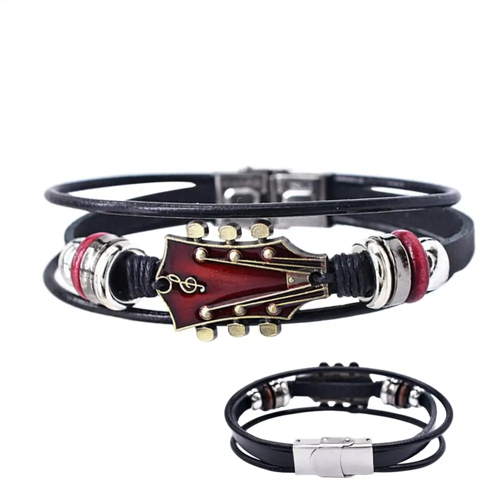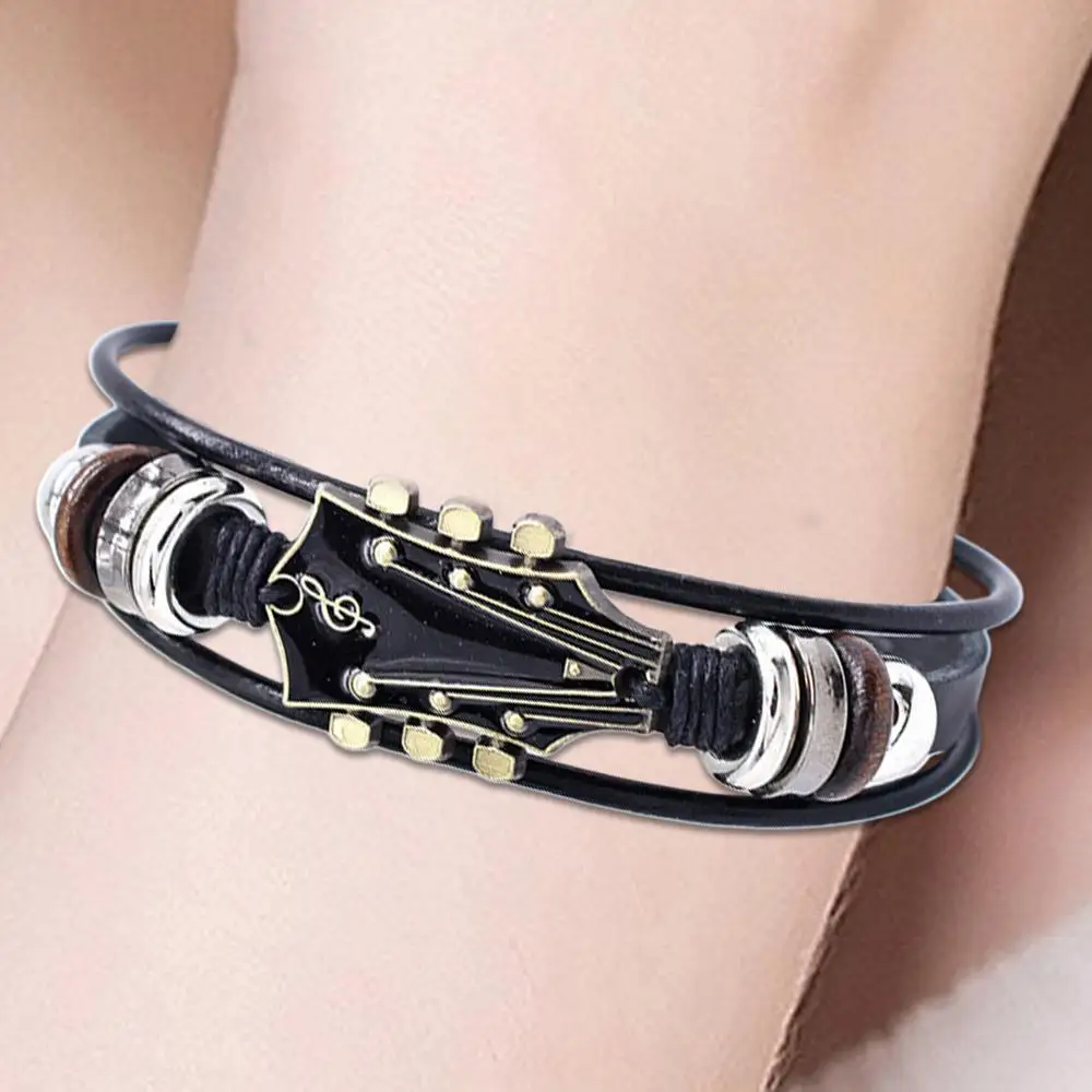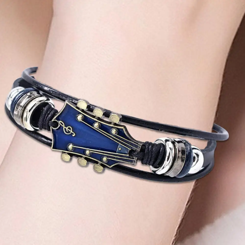 Braided Guitar Bracelet Zinc Alloy Adjustable Buckle Manual Woven Faux Leather 3-Layered Retro Punk Wrist Jewelry Gifts